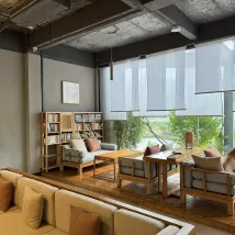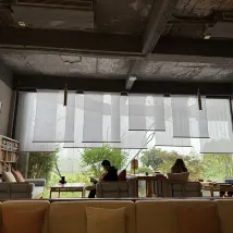 Ursprünglich gefiel mir die Gestaltung der Lobby mit Fenstern, die Ausblicke ermöglichten, aber dieses Mal war sie durch Bücherregale blockiert, was schade war.