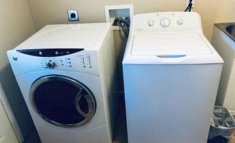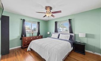 Spacious 2,350 sq ft, 3 bedrooms with king size beds, 2 full bathrooms - house with living room (with couch, loveseat, and work space), game room (with futon), and laundry room. Backyard has a BBQ grill, table with 6 chairs, an umbrella, outdoor couch, extra foldable chairs, fire pit, trampoline, playground, and small child's table. This house can accommodate 8 people, but above 6 is $55 per person. Very close to town. Safe motorcycle parking available.