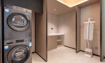 出酒店走2公里就是高鐵站和口岸,趕早班高鐵太方便了。大堂設計得很有格調,自助販賣機和機器人送物特別貼心,半夜想喝個飲料不用跑出去。房間裏設施很新,尤其是洗衣烘乾一體的機器+熨燙機,出差黨直接愛了!