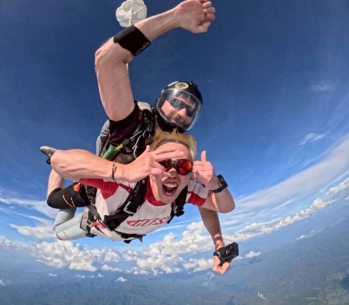 Begleite uns beim Tandemfallschirmsprung und lass alles in HD auf der am Handgelenk deines Instructors befestigten GoPro aufzeichnen.