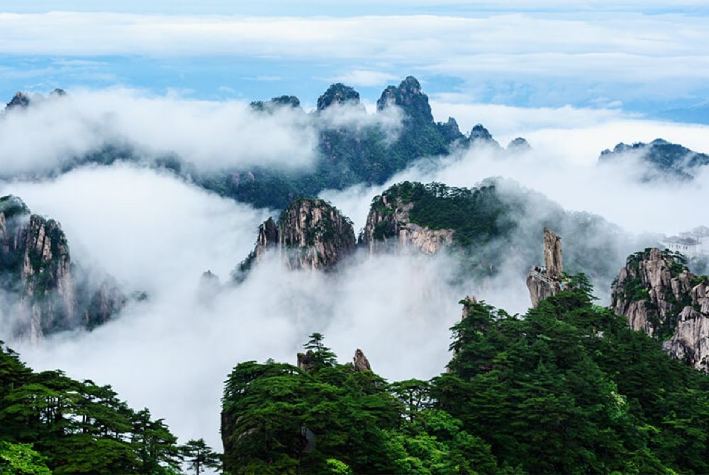 ▲ Huangshan ist ein duales Weltkulturerbe und Weltnaturerbe, berühmt für seine "Fünf Wunder": seltsame Kiefern, groteske Felsen, das Wolkenmeer, heiße Quellen und Winterschnee. Die Begrüßungskiefer: Sie wächst auf der linken Seite des Yuping-Pavillons in 1670 Metern Höhe und ist etwa 1300 Jahre alt. Ein Ast streckt sich aus, als würde er die Touristen mit offenen Armen willkommen heißen. Sie ist das Wahrzeichen von Huangshan.