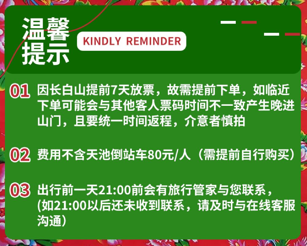 1. Bitte buchen Sie Ihr Ticket zum Hauptgipfel des Tianchi-Sees 7 Tage im Voraus um 18:00 Uhr (bitte buchen Sie unbedingt im Voraus, da bei einer späteren Buchung keine Tickets mehr verfügbar sind).