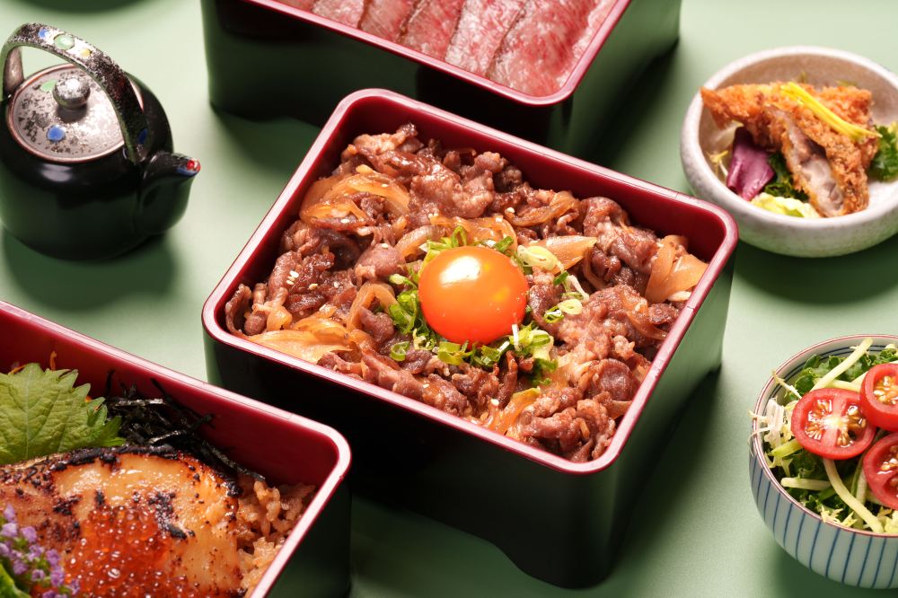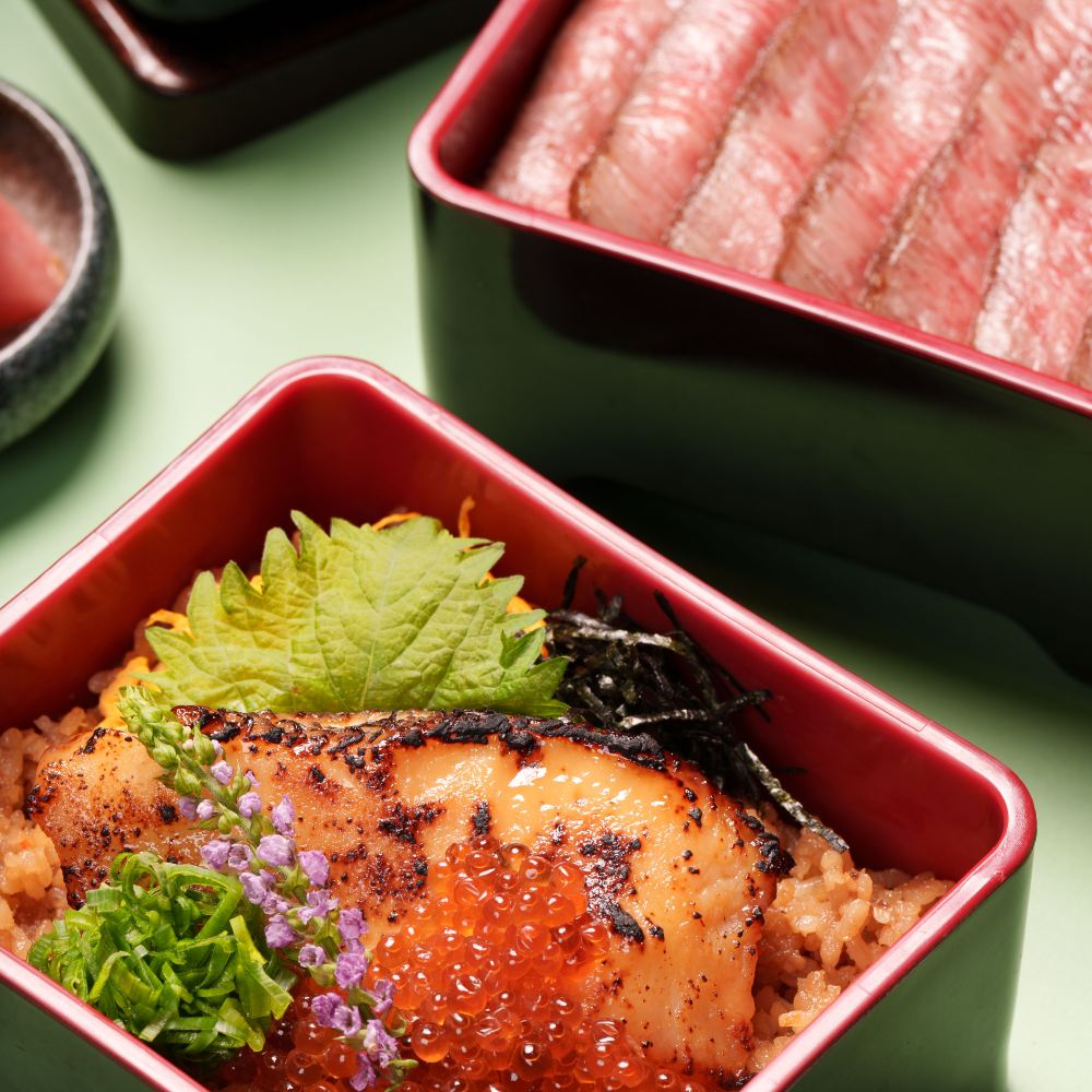 Mondlicht-Schwarzwild-Schweinefleisch-Grill-Bento-Box (Schwarzwild-Schweinefleisch, japanische Süßsoße, in Sojasoße eingelegtes [Traumkönig] Eigelb, Misosuppe, japanisches eingelegtes Gemüse)