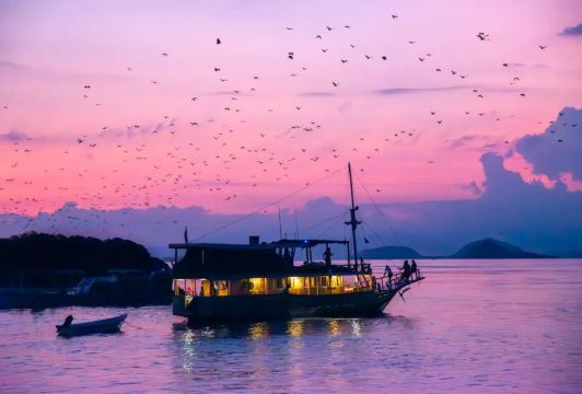 ▲ In der Dämmerung des Komodo-Nationalparks fliegen Tausende von Fledermäusen aus ihren Höhlen und bilden eine spektakuläre "Fledermauswolke", die den Sonnenuntergang mit einer mystischen und beeindruckenden Note versieht.