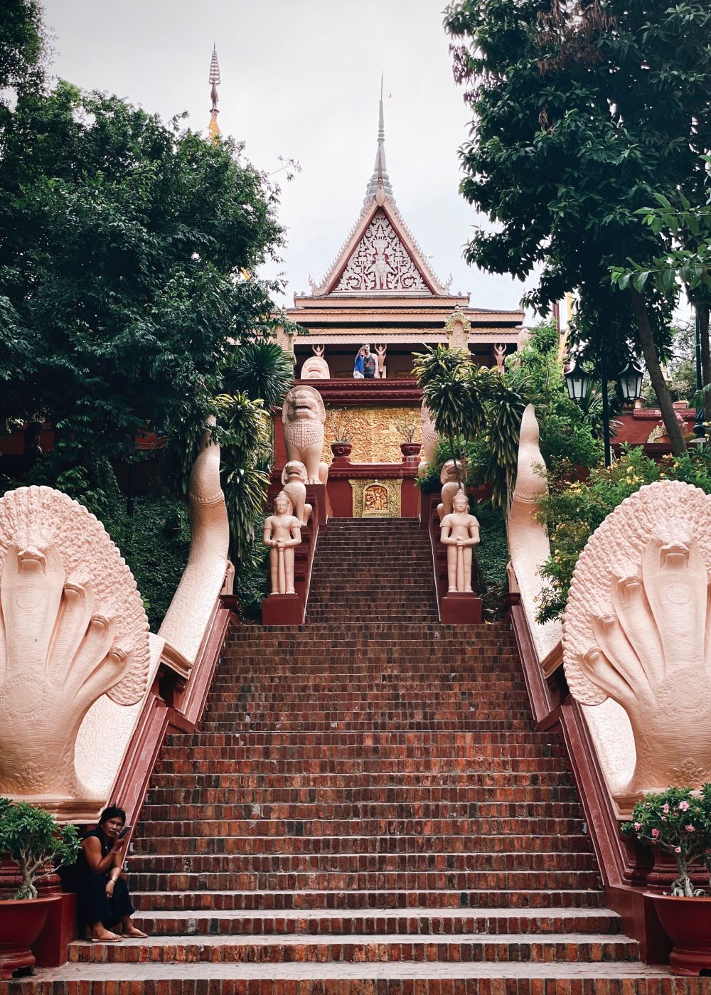 ▲ Der Tempelberg Tempel befindet sich auf dem Gipfel eines Berges, wo ein etwa 30 Meter hoher buddhistischer Stupa majestätisch thront. Am Fuße des Berges liegt ein kleiner Park, der den Bürgern zur Erholung dient. Am Eingang kann man eine Skulptur der siebenköpfigen Schlangengottheit sehen, die für "günstiges Wetter und reiche Ernte" steht.