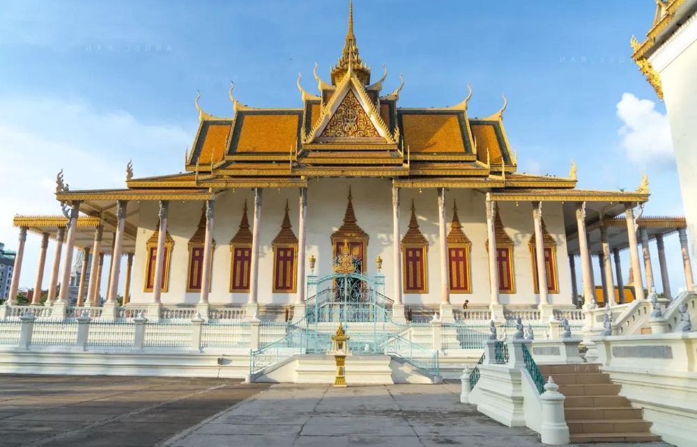 ▲ Der Königliche Palast in Phnom Penh ist ein Komplex mit goldenen Dächern und von gelben Mauern umgebenen Gebäuden, der über 20 große und kleine Paläste umfasst, darunter die Chanchhaya-Halle, die Goldene Halle, die Silberne Halle, die Tanz- und Musikhalle sowie die Schatzkammer. Die Wandelgänge sind mit Reliefs im Stil von Angkor Wat verziert. Die Chanchhaya-Halle ist mit geschnitzten Balken und bemalten Säulen sowie glasierten Dachziegeln ausgestattet und bildet zusammen mit der linksseitigen, golden glänzenden Pagode Preah Morakot eine beeindruckende Szenerie.