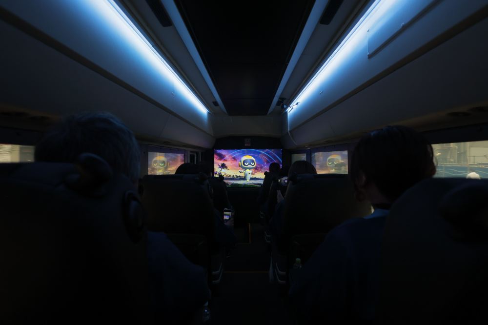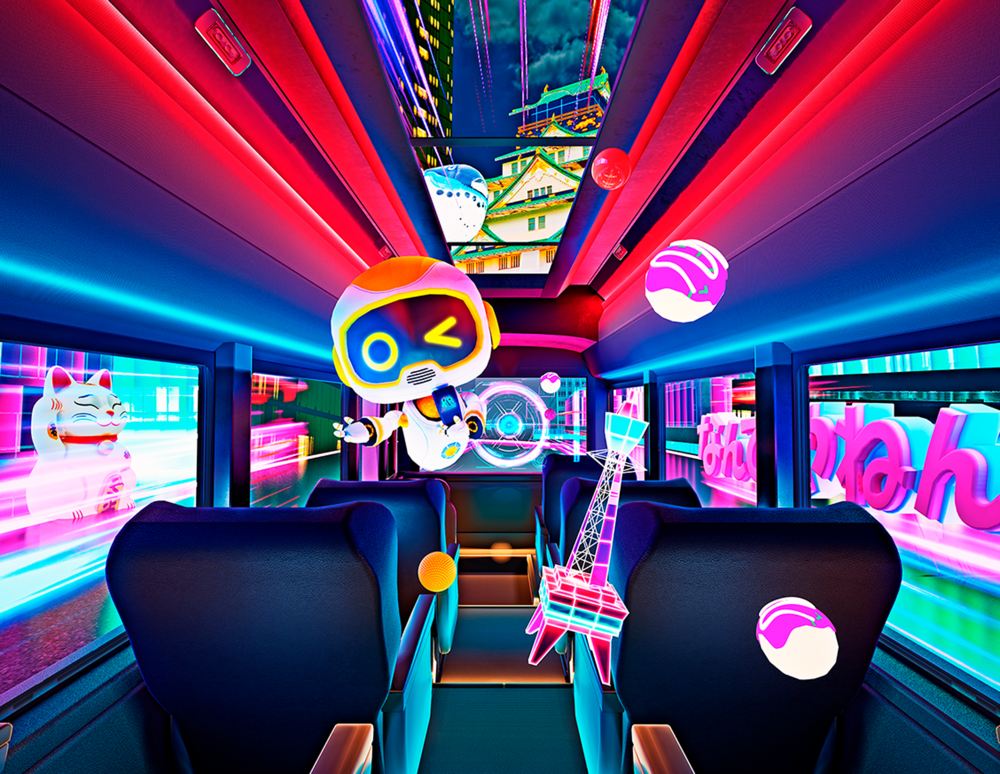 Im futuristischen XR-Reisebus erwarten Sie der KI-Reiseleiter TEMPURA und der menschliche Reiseleiter AMI.