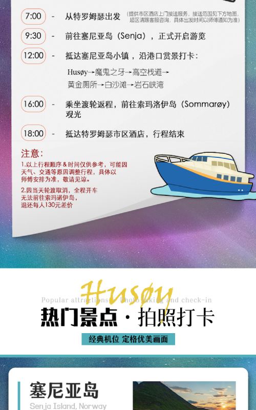 Da die Fähre abgesagt wurde und man nur mit dem Auto fahren konnte, musste die Reise nach Sommarøy abgesagt werden. Die Preisdifferenz von 130 RMB pro Person wird erstattet; wer damit ein Problem hat, sollte vorsichtig sein!!!